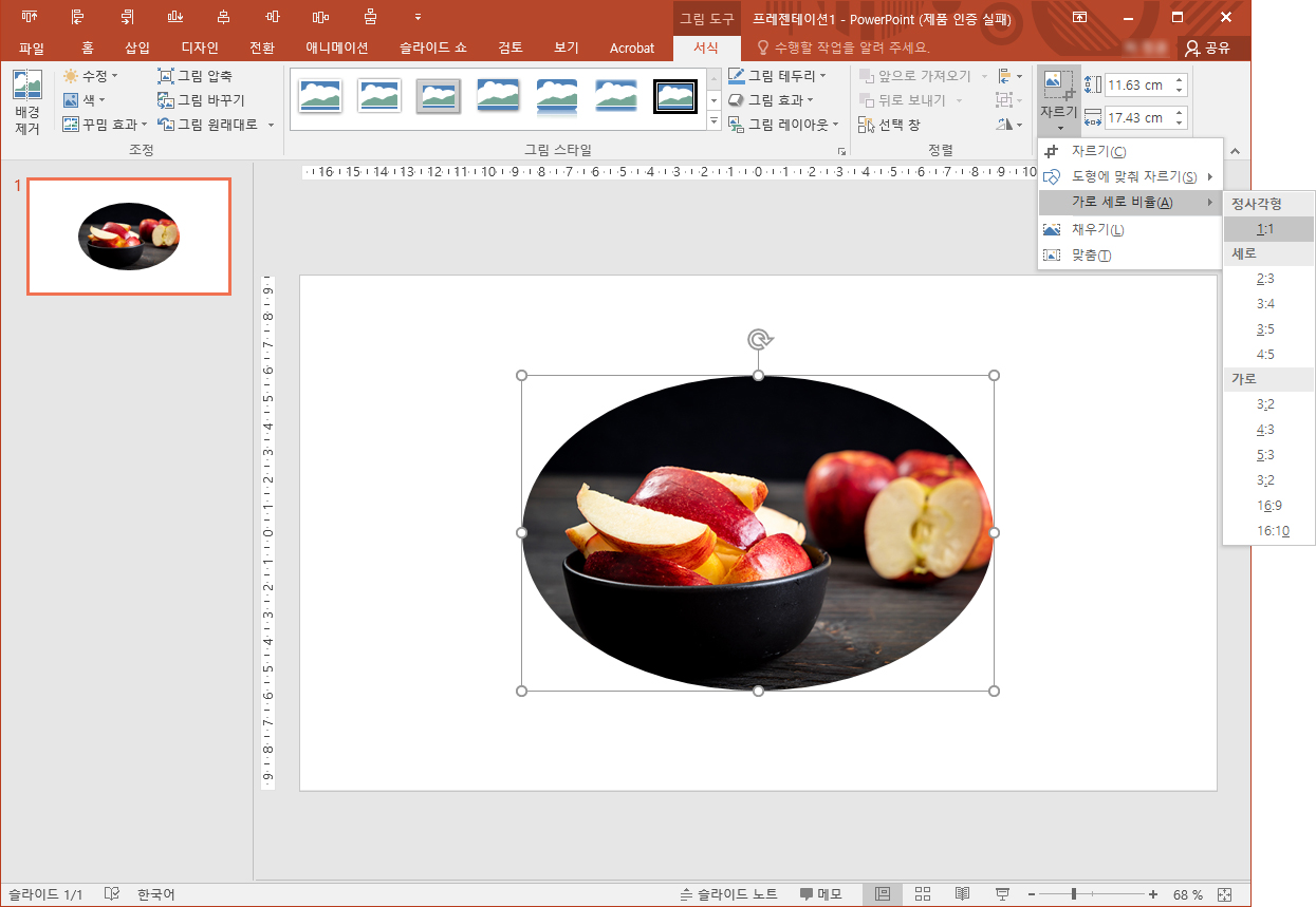 자르기 - 도형에 맞춰 자르기 - 타원 을 선택합니다.