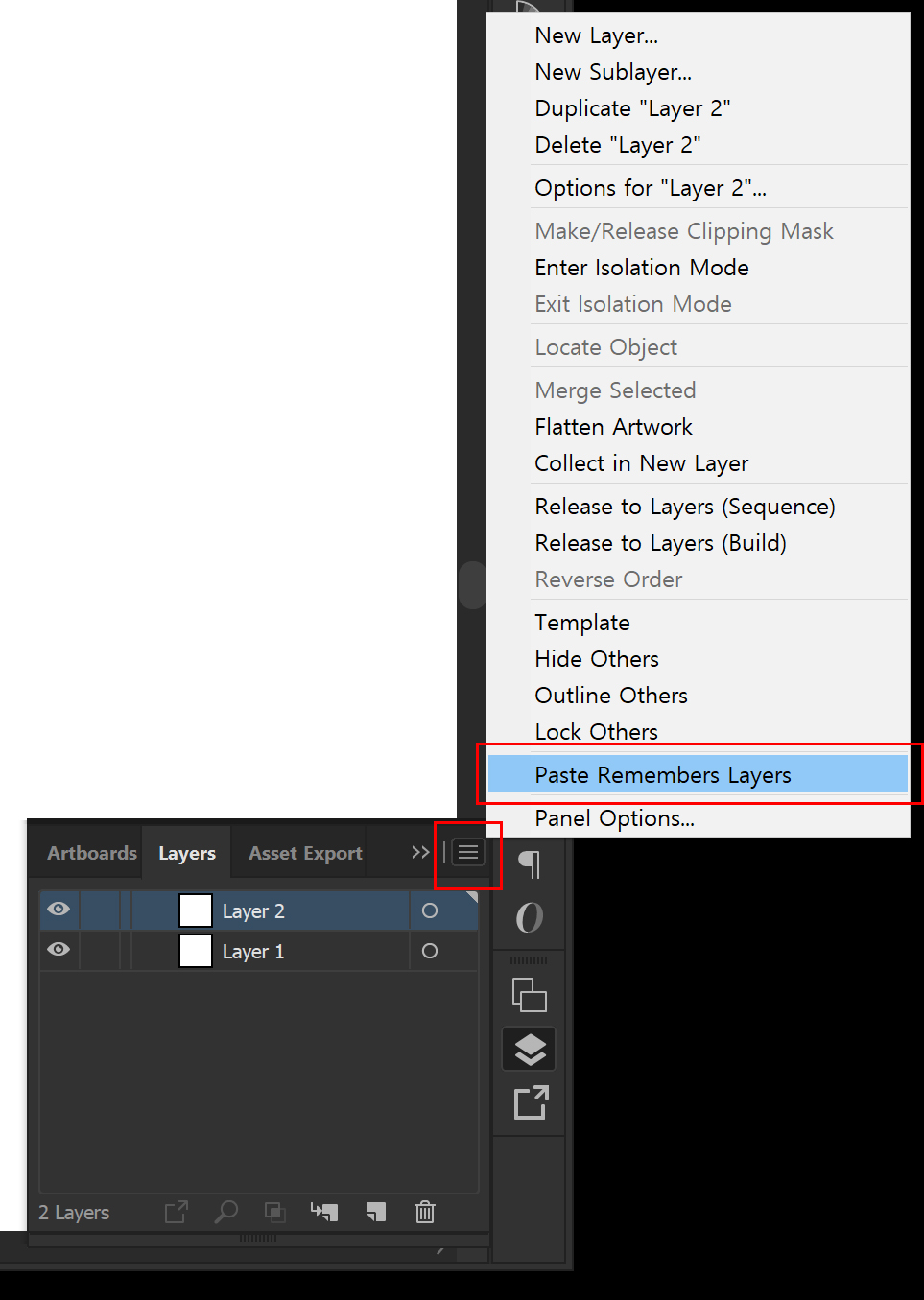Layer1 에 있는 객체를 복사해서 Layer2에 붙여넣기 하려고 하면