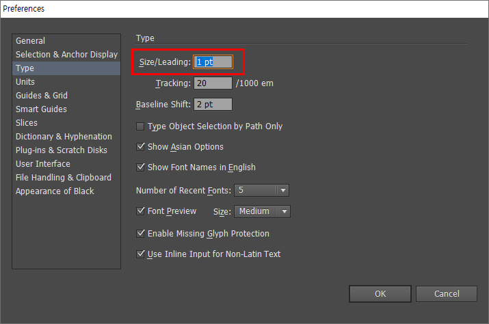 Edit - Preferences - Type 에서